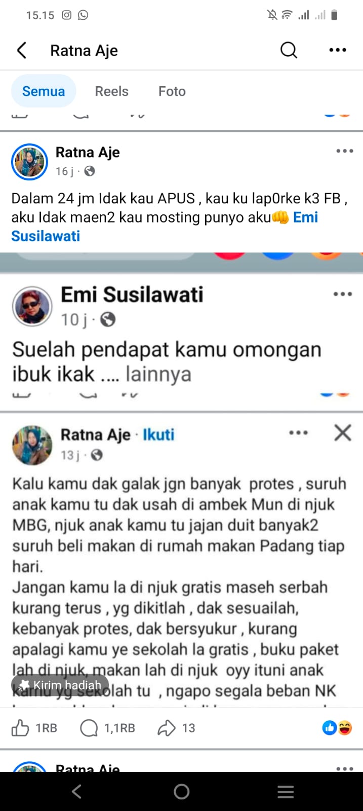 Dalam tangkapan layar yang beredar, akun tersebut melontarkan kalimat bernada ancaman kepada akun Emi Susilawati, bahkan disertai emoji kepalan tangan. Pernyataan itu memicu reaksi keras dari warganet yang menilai komunikasi tersebut tidak mencerminkan etika, terlebih dalam program pemerintah yang menyasar kepentingan anak-anak sekolah.