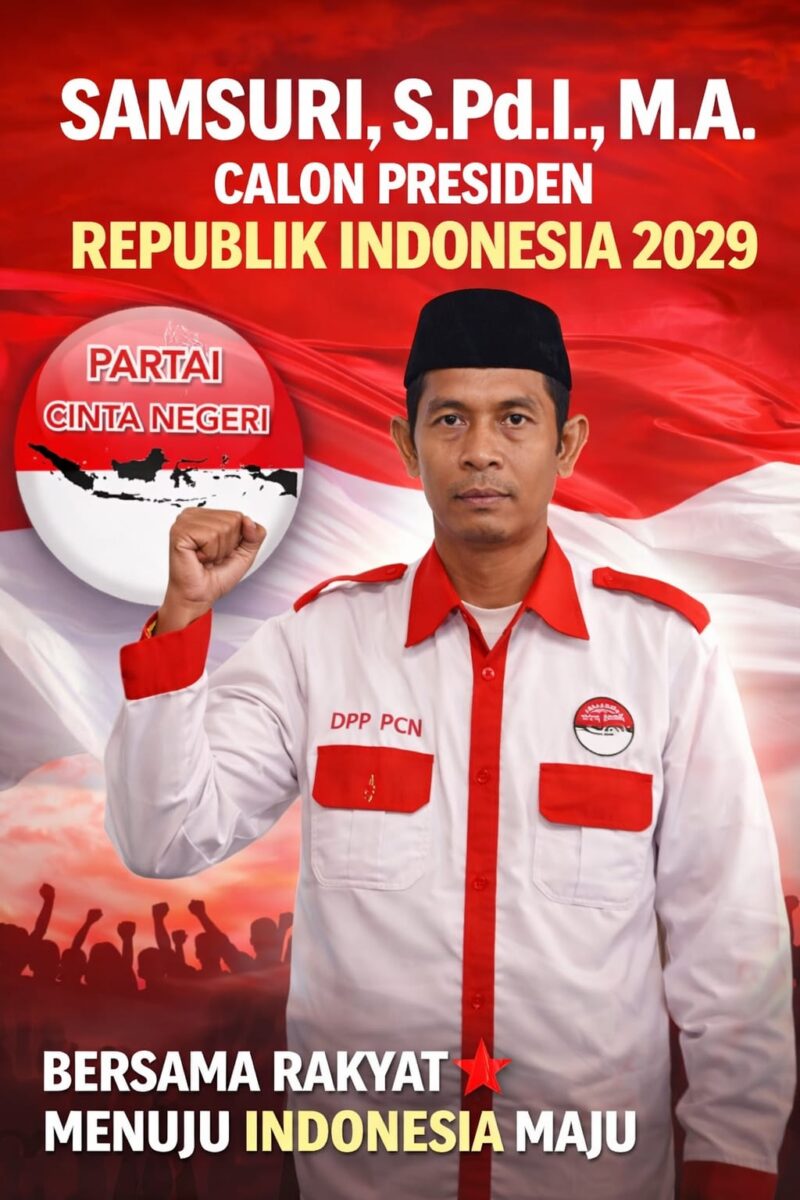Jakarta | Sosok pendiri sekaligus Ketua Umum Partai Cinta Negeri, Samsuri, S.Pd.I, M.A, dideklarasikan sebagai Calon Presiden Republik Indonesia untuk Pemilihan Presiden (Pilpres) 2029 oleh Dewan Pimpinan Pusat Partai Cinta Negeri (DPP PCN). Deklarasi tersebut dibacakan oleh Ketua Bidang Litbang DPP Partai Cinta Negeri, Bapak Suwarno, pada hari Minggu, 27 April 2025, pukul 14.00 WIB hingga selesai.